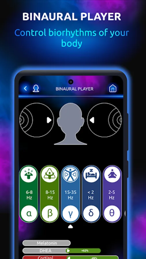 - Application automatically balances Alpha, Beta, Gamma, Delta, and Theta frequencies according to the track being played,