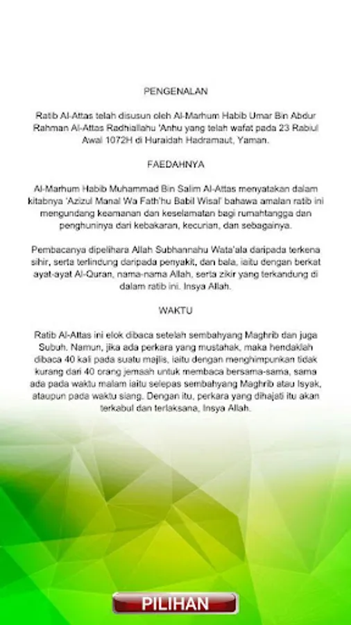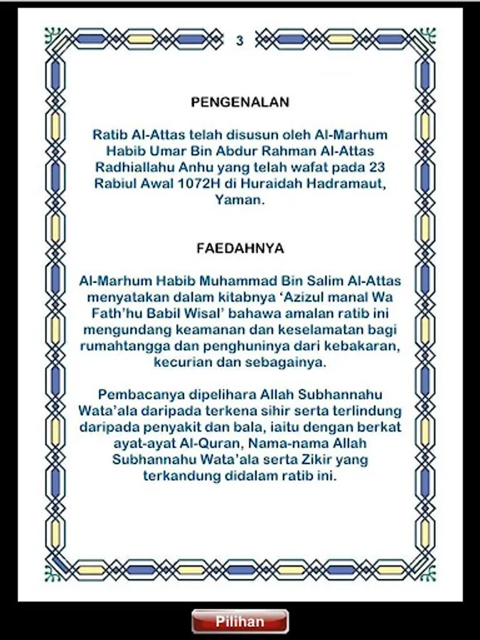It is hoped that this app will help muslim users to practice Ratib Al-Attas wherever and whenever possible.