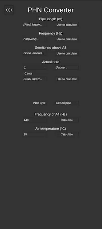 - A converter between pipe length, frequency and note, with customizable air temperature and reference pitch;