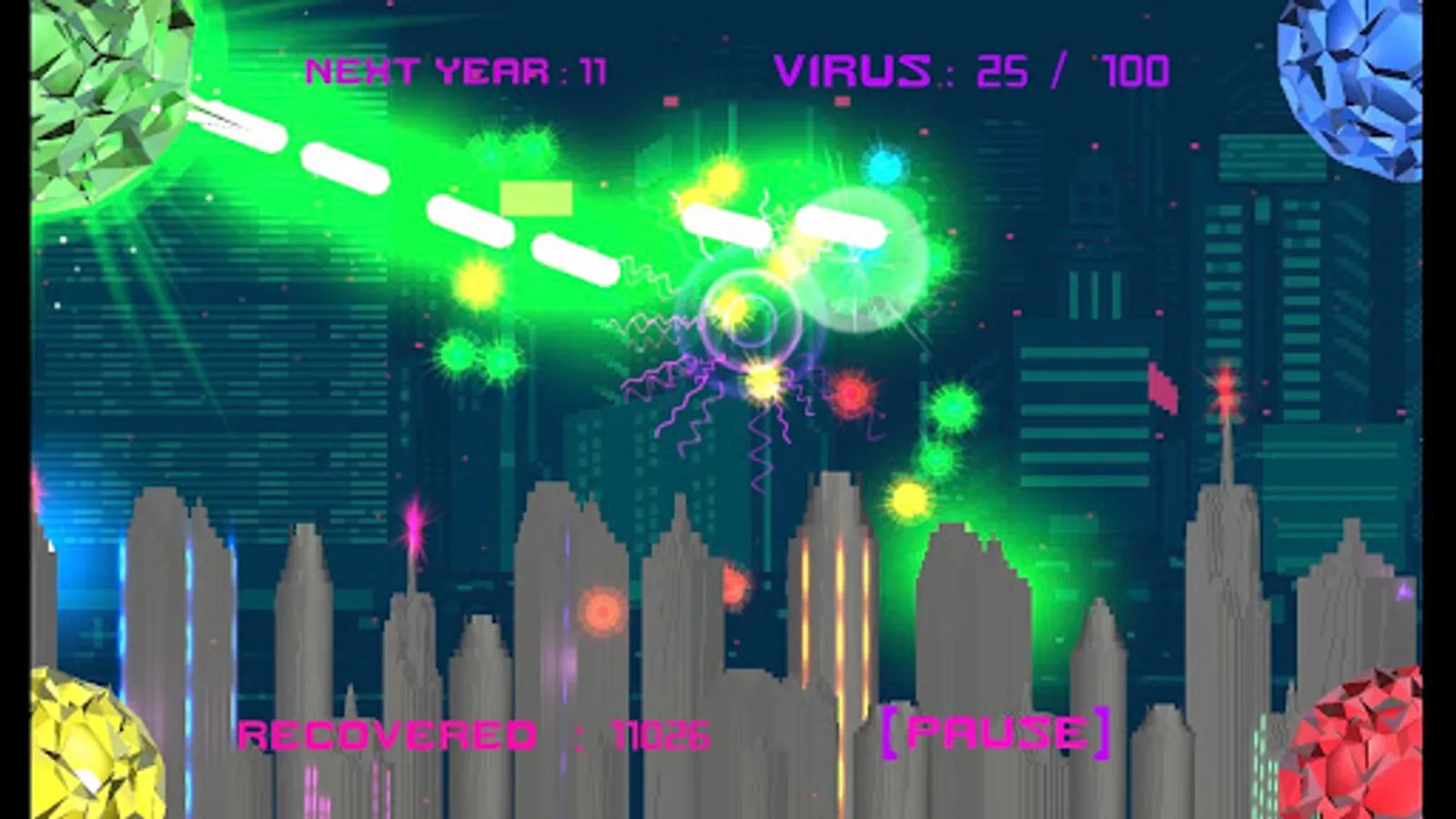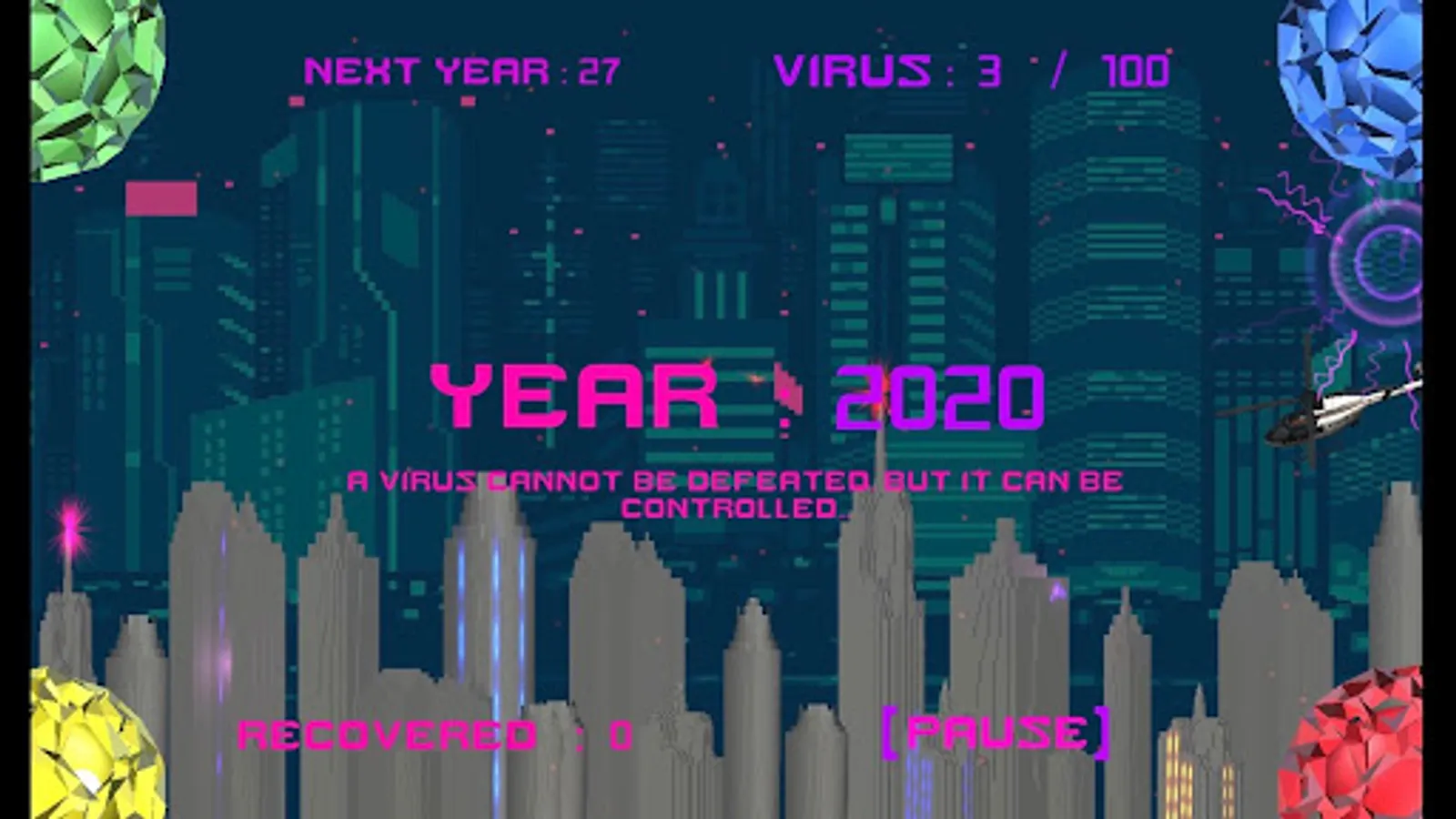 Before you download the game, I need to inform you of how the game plays before you play. We all know that the game starts in the year 2020, but the years progress by one every time the timer above your screen ends and resets itself. You get rewarded as the player by an increase of 10,000 points to your score (recovered) for surviving the enemy every year and get additional points added to your score by eliminating the viruses. As every year passes, the game will progressively get harder, and surprising events will happen at which year, you’ll find out. Luckily, as the player, you're receiving care packages from helicopters passing by that can give you an edge for your weapons. In order to use these weapons, you must have two thumbs on your phone and then the weapons will aim in the middle of your two thumbs. As the player, your ultimate goal is to keep the number of viruses from going above the 100 mark. If you hit the 100 mark it's game over… You’re competing with players across the globe to prevent this enemy from spreading and overrunning humanity; the question is, how long will you survive?