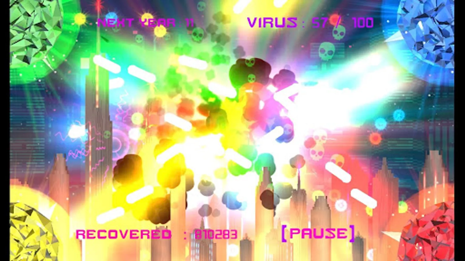 The music for this game was created with a more dramatic tone and with elements of cyberpunk embedded in the songs. It suits the theme of the game but also creates a mood where the world is in an uncertain situation, but you’re winning the war and enjoying it as you're killing viruses. Try and survive for the entire length of the soundtrack to hear the remix version which is only available within the game!