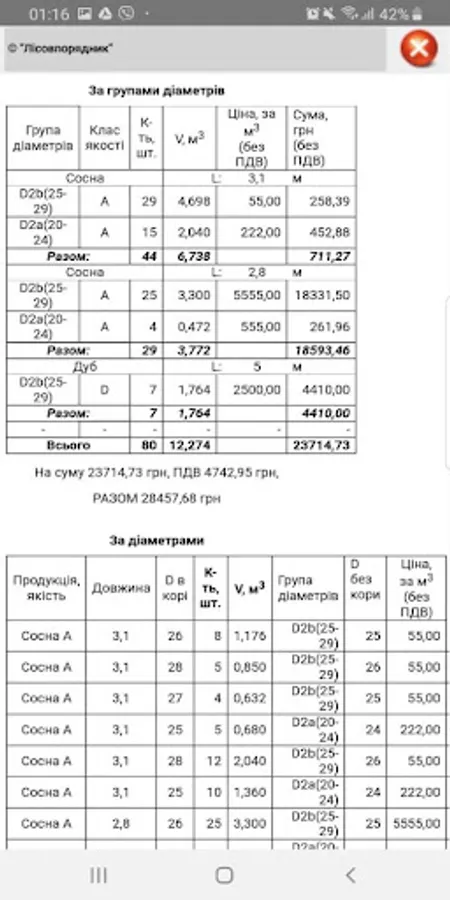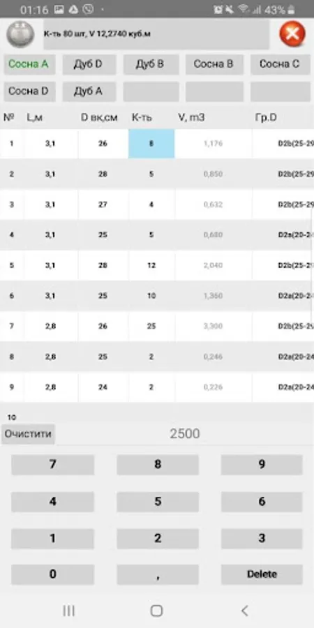 Kubaturnik to determine the volume of logs based on DSTU-4020-2-2001 by the median diameter of the log in the bark and the length with the possibility of estimating the value of timber production.