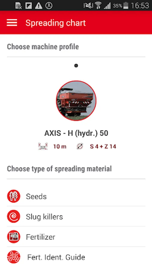 For increased fertilizer spreading efficiency, KUHN has developed an application to assist you in the fertilizer spreader adjustments. Considering the multitude of fertilizers available on the market, it is essential to identify and select the right fertilizer in the spreading charts. This application will guide you through the settings to use for spreading the right dose and obtaining a good lateral distribution.