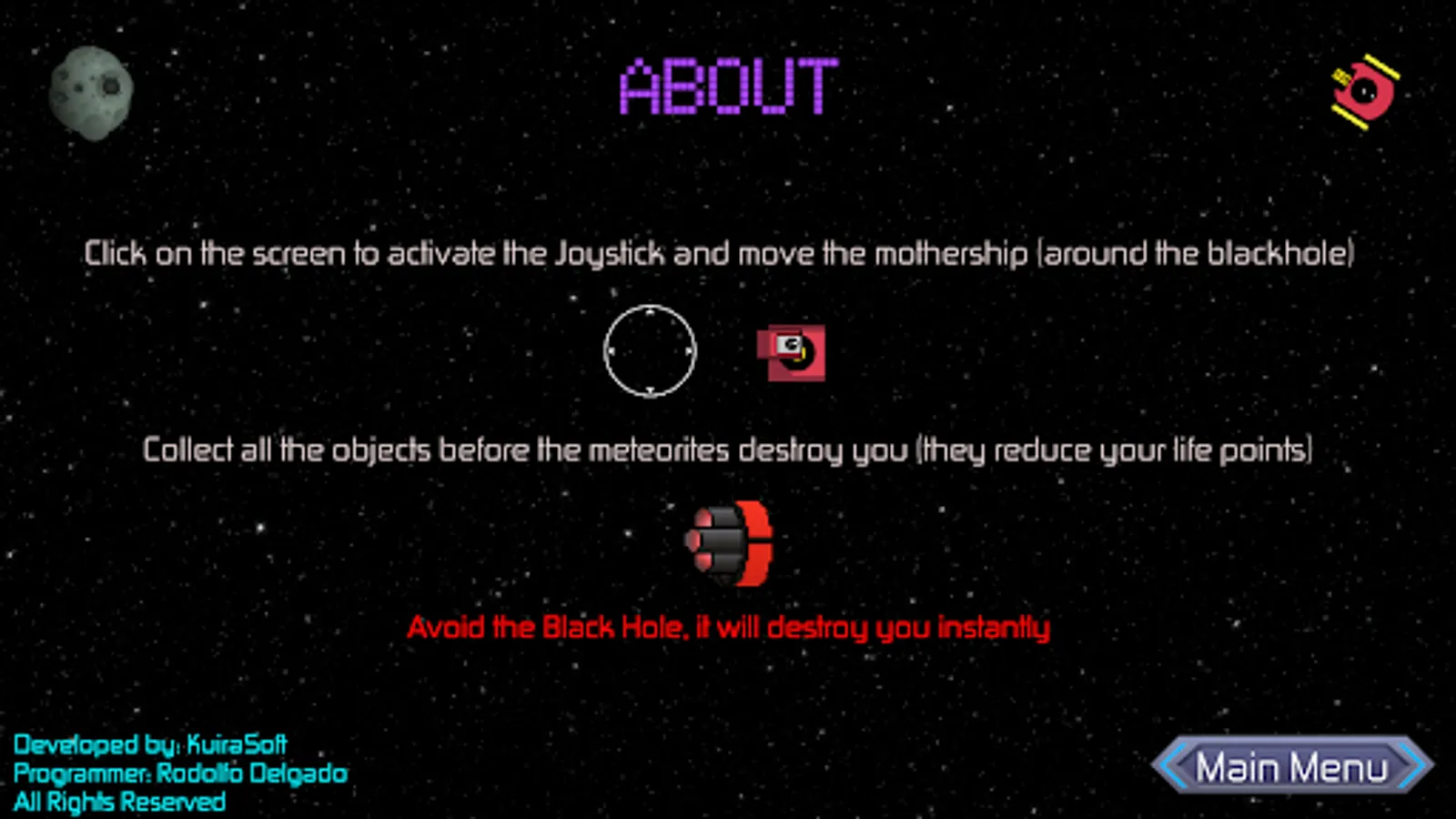 Very entertaining and addictive game that allows you to know the planets of the milky way, the mission is to try to collect the parts of your ship and avoid being destroyed by meteorites or the black hole.