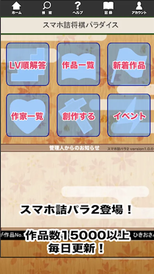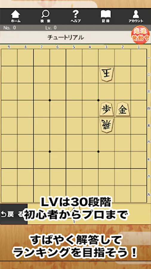 More than 15,000 works by 2,900 Tsume Shogi writers will be released. There are 30 levels. If you solve the Tsume Shogi and raise the level, you will be able to try more works. There is a time attack ranking and a clearing order ranking for each individual problem. Let's do our best and aim for rank-in.