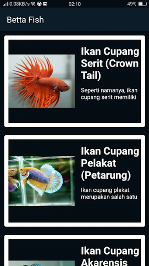 Betta Fish is an application that provides information about Betta fish. This application was created with the aim of helping betta fish lovers to know the types of betta fish and most of them still do not know how the characteristics of various types of betta fish. This application also makes it easier for betta fish lovers to find the betta fish they want. In this application there is a description of the betta fish which consists of a description of the fish, the type of fish, and the price of the fish. In this application using the database in realtime. So, this application will change the data directly.