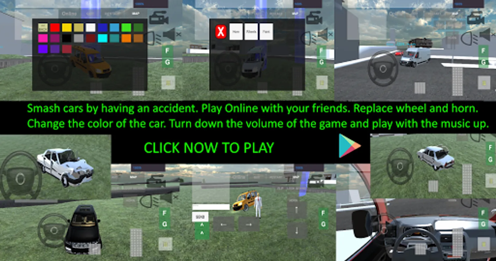 If you are looking for a car crash simulation and want to get it online, this game is for you. This crash game is a game with more cars, different menu interface design and more different maps than other car crash games. In addition to the feature of making an accident in the game, there are also the features of changing the color, changing the wheel, changing the horn and making them visible to your friends online. In this game, you can get off the car, drive around the city, stunt on ramps, tumble around with your car. Enjoy the online car game with your friends.