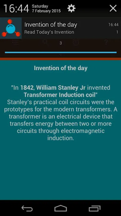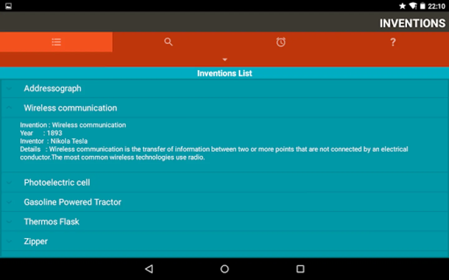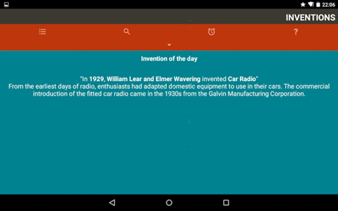 Inventions App shows a random Invention a day along with Inventor name , year and a fascinating fact about the invention.You can view all 400+ inventions and read the details.App lets you search for particular inventor, invention or even year. Set daily notification and read "Invention of the day" at your convenient time.