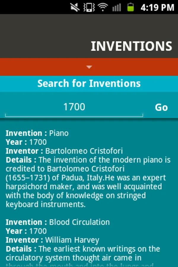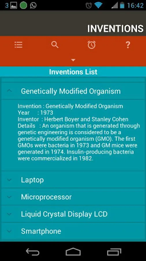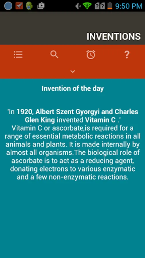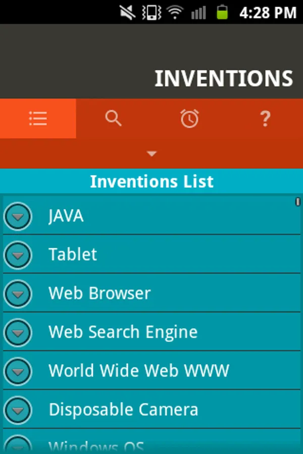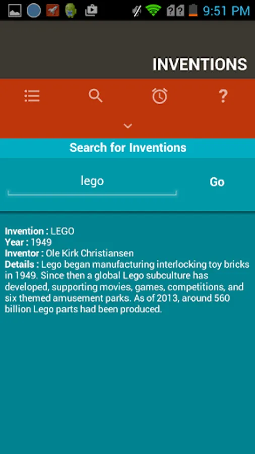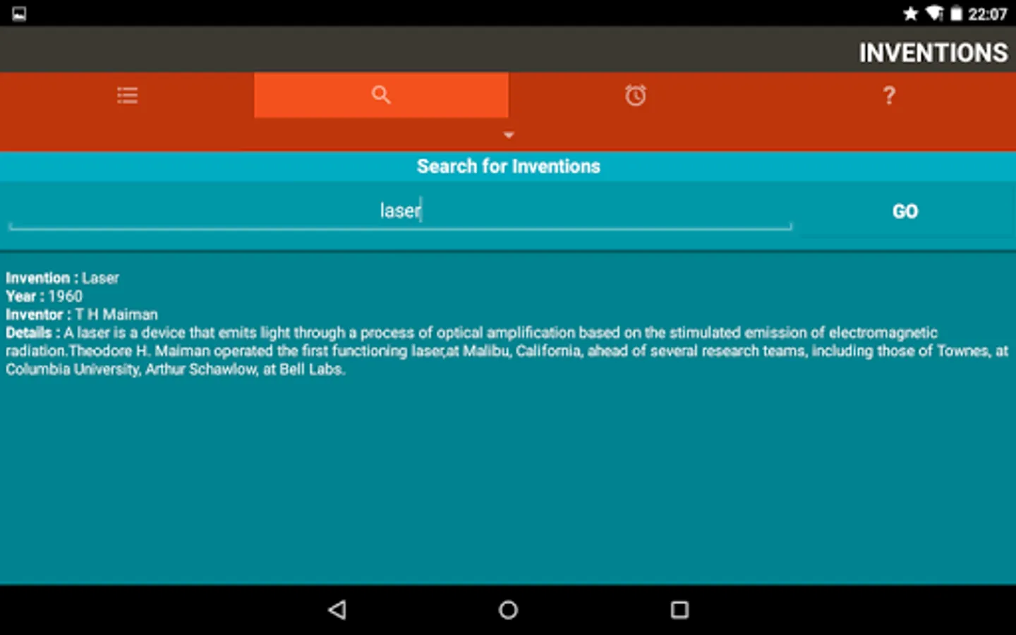 Inventions App shows a random Invention a day along with Inventor name , year and a fascinating fact about the invention.You can view all 400+ inventions and read the details.App lets you search for particular inventor, invention or even year. Set daily notification and read "Invention of the day" at your convenient time.