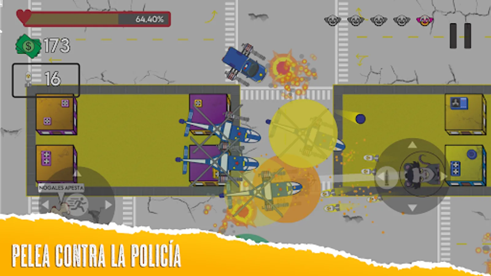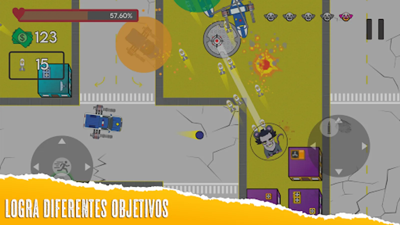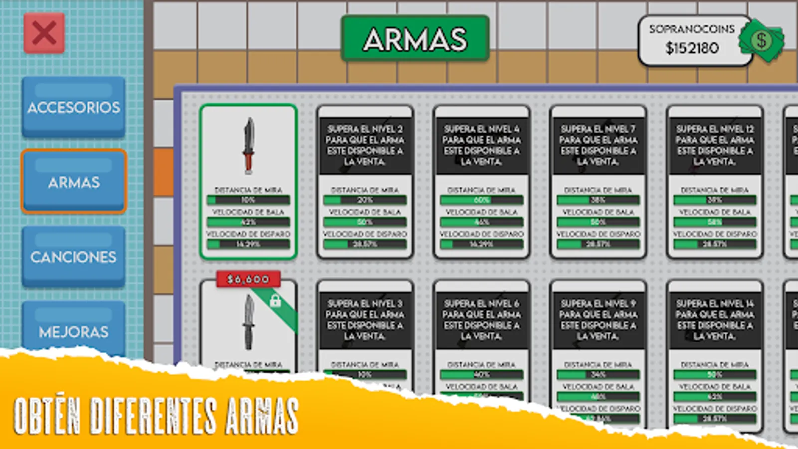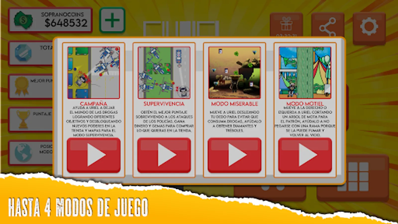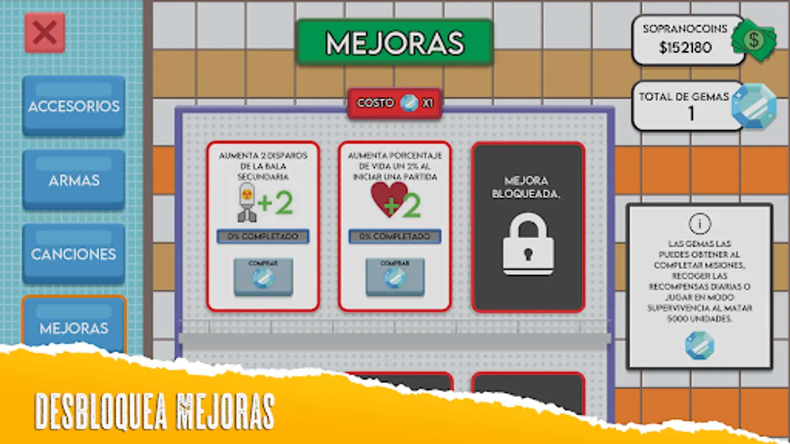 The game includes 4 game modes, the campaign, survival mode, miserable mode and XD druggie mode so the fun doesn't end, it also includes a store where you can buy different accessories, weapons, improvements and background songs.