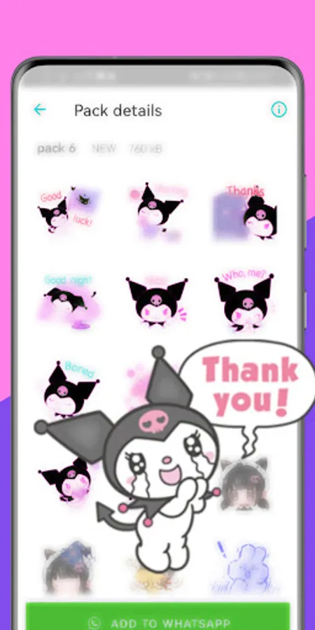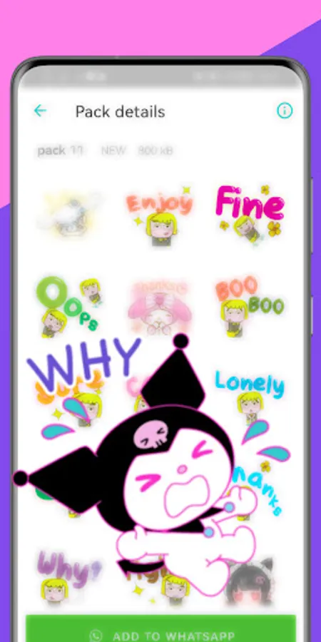 Overall, the Kuromi Sticker Emoji WASticker app offers a delightful way to add a touch of cuteness, humor, and personality to your WhatsApp conversations. With its extensive collection of Kuromi stickers and regular updates, this application is a must-have for fans of the character and those who enjoy expressing themselves creatively through stickers.