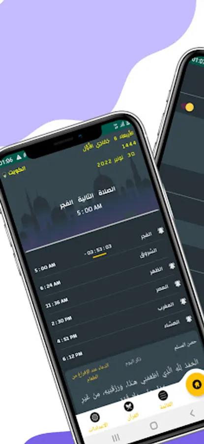 The application "Prayer times in Kuwait and the call to prayer" displays prayer times on a screen with a wonderful and attractive design and times similar to the Ministry of Awqaf and Islamic Affairs in Kuwait, as well as displays the next prayer and the remaining time for the call to prayer.