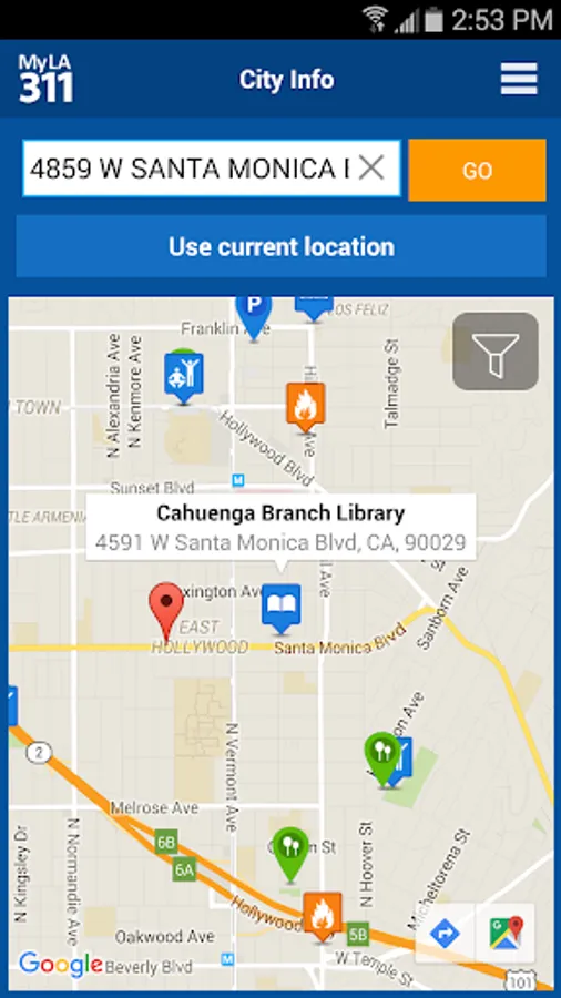 • Looking for the nearest park? Want to cool off on a hot day? Need to return a library book? The ‘City Info’ feature conveniently maps the closest parks, libraries, fire and police stations, golf courses, public pools, tennis courts, golf courses, parking lots, and more.
