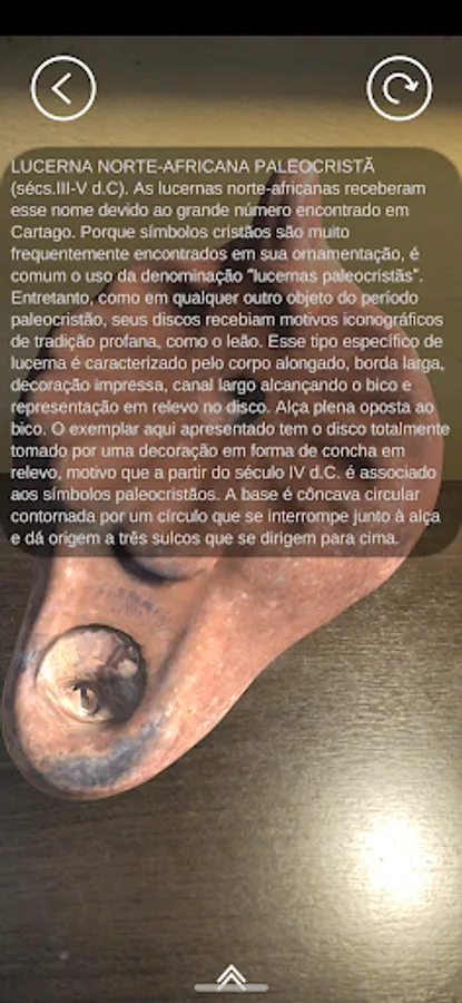 LUCERNAS RA is an application developed by the Provincial Roman Archeology laboratory of the Museum of Archeology and Ethnology of the University of São Paulo. In it, you can view a part of our collection of ancient Roman and Greek lucerns (lamps) in Augmented Reality, each one containing its own information.