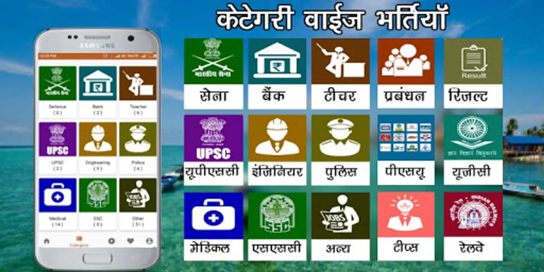 * This categories tab includes several subcategories like Banking Jobs, Police Bharti, Teaching, Jobs for Railways, UPSC, Sports, Defense, IIT, Public Sector, PSC Naukri.