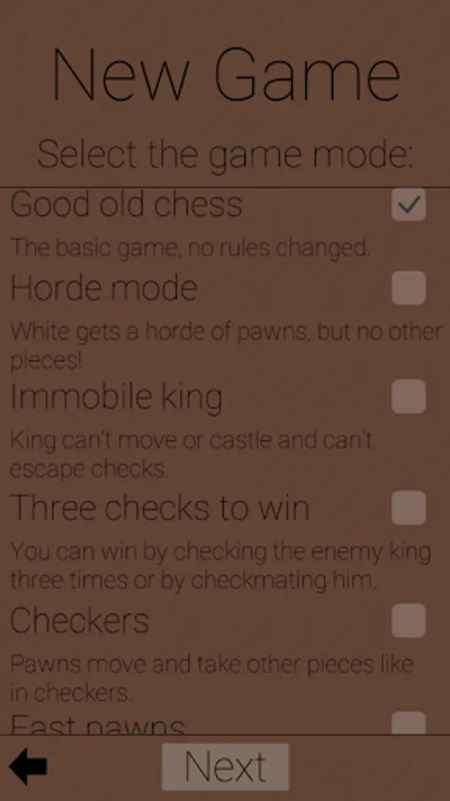 They range from replacing your pawns as checkers, "Horde" mode or "Hill king" to smaller gameplay tweaks, like no castling. There are already 24 different game modes (including normal version of chess) in the game, but that number will surely increase. Currently, you can only play locally with a friend, but I will try to add online multiplayer. The game is fully fleshed out, with everything you would expect from other chess apps.