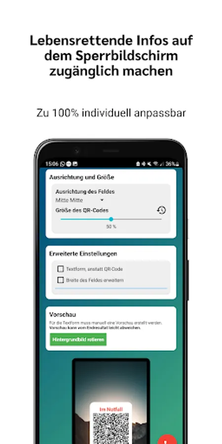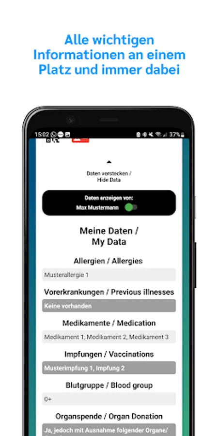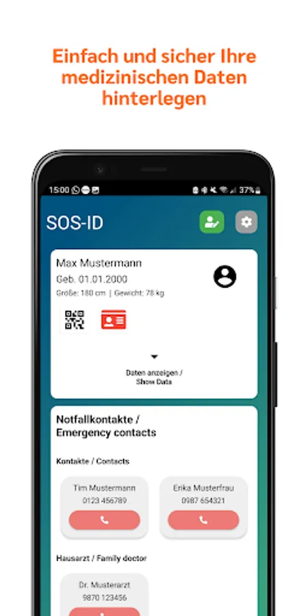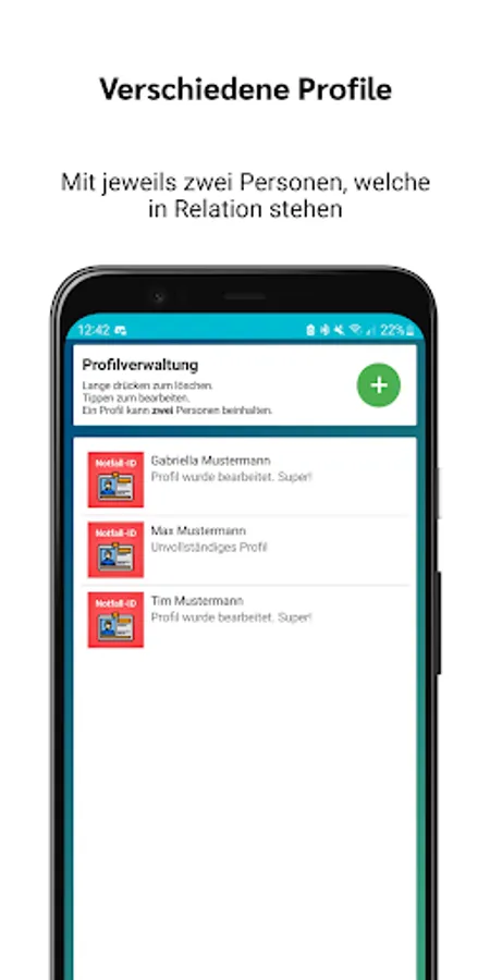 Emergency ID / emergency passport allows you to create various medical profiles, which can be made accessible via QR code on the lock screen. You can store an unlimited number of profiles, each with two people who are related.