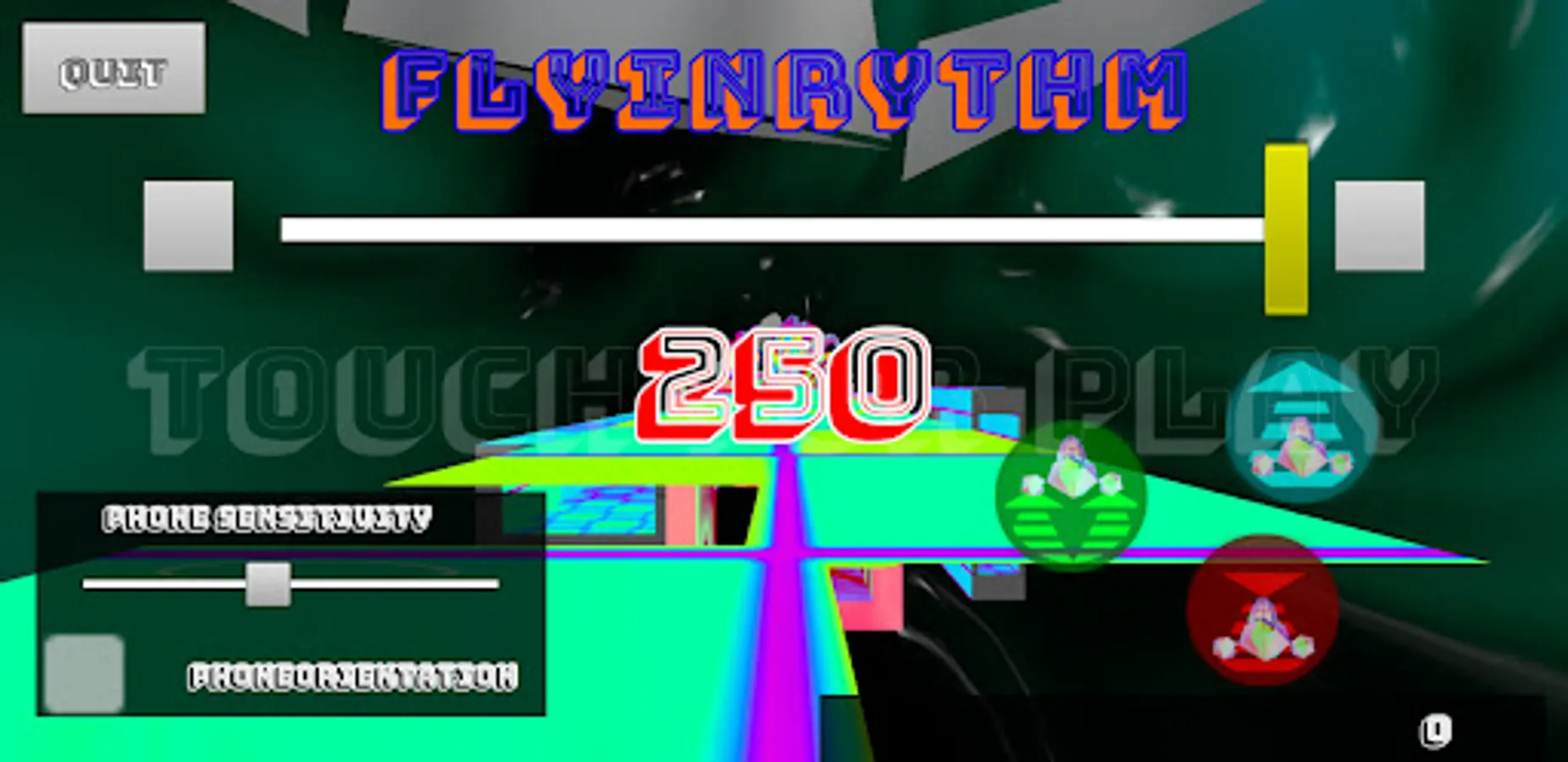 Dans Flyin Rythm vous devez piloter un vaisseau à l'aide d'un stick de direction ou au choix, l'orientation du téléphone, et sauter sur les plateformes générées procéduralement et arriver à la fin de chaques parcours pour débloquer le suivant. Attention à la chute ou à l'impact des obstacles ou des projectiles des ennemis qui vous referont recommencer la course. Cependant des objets bonus sont disséminés au travers des parcours et vous permettent de bébloquer les niveaux si ils sont trop difficile à terminer et le Dash ou le freins vous permettront de corriger la trajectoire du vaisseau si, toutefois, vous possédez les bons reflexes !