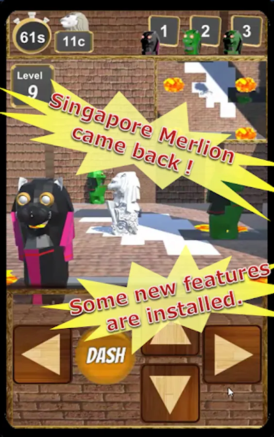 - If 'BIG' sign appear, try to tap DASH button. Your Merlion will be changed stronger !