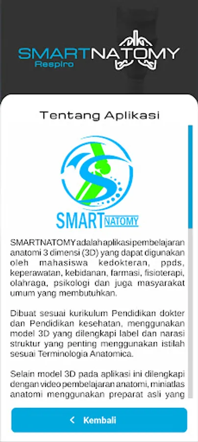 SMARTNATOMY is a 3-dimensional (3D) anatomy learning application that can be used by medical students, ppds, nursing, midwifery, pharmacy, physiotherapy, sports, psychology and also the general public in need.