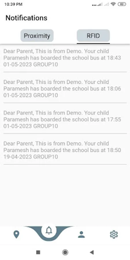 • Parents will receive notifications when their child swipes his/her RFID card on boarding the school bus, confirming the safe boarding status of their child.