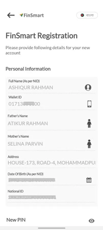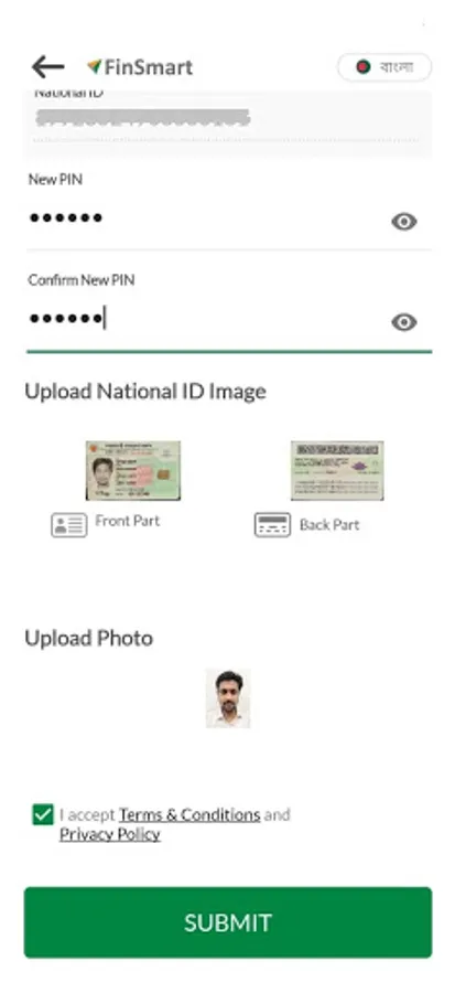 3. Review your personal information, set a 6-digit PIN for the next login, upload the front and back part of your NID and take a selfie with the front camera of your mobile phone.