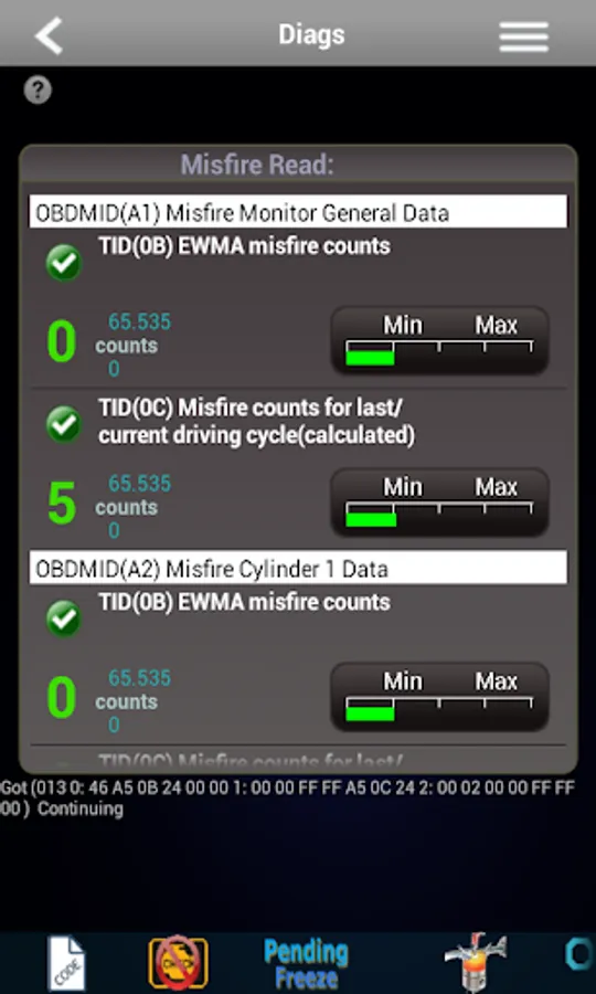 Raw/debug logs option. Freeze/Pending Codes, Mode6 , Misfire readings with analysis charts. GPS logging option with KML , Placemarkers for Max/Mins and path of log mapping. O2 diagnostics mode sensors layout are displayed with current voltages Instantaneous Fuel consumption sampling/logging. Boost sampling. English and Metric units. OBD command expert to access directly the ECUs with scripting capabilities