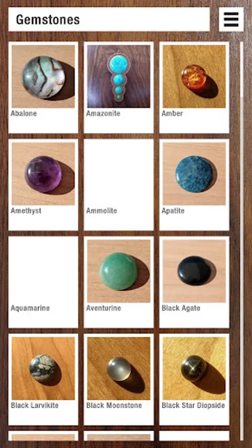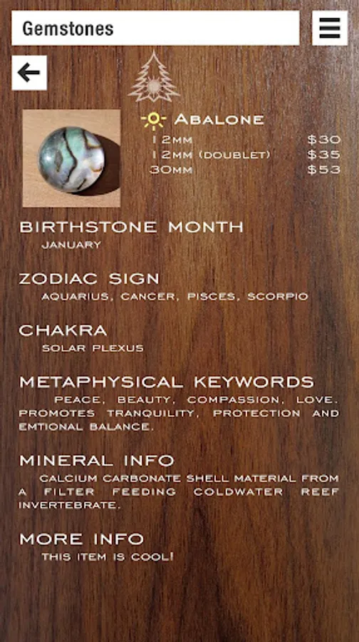 Displays info about gemstones, designs and wood types taken from database. Searchable by keywords.