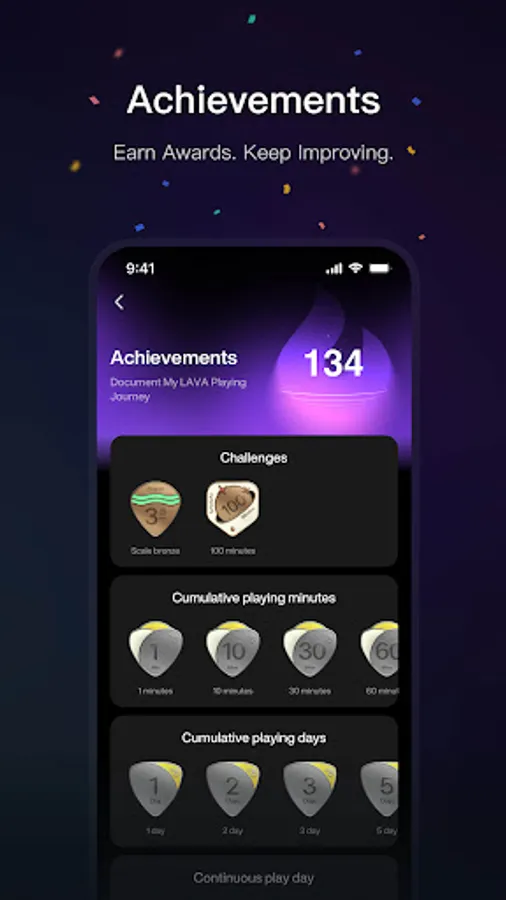 - View your playing and practice summary and the awards you earned for each achievement. Share the success with friends to celebrate.