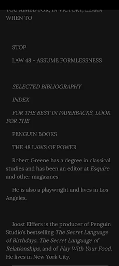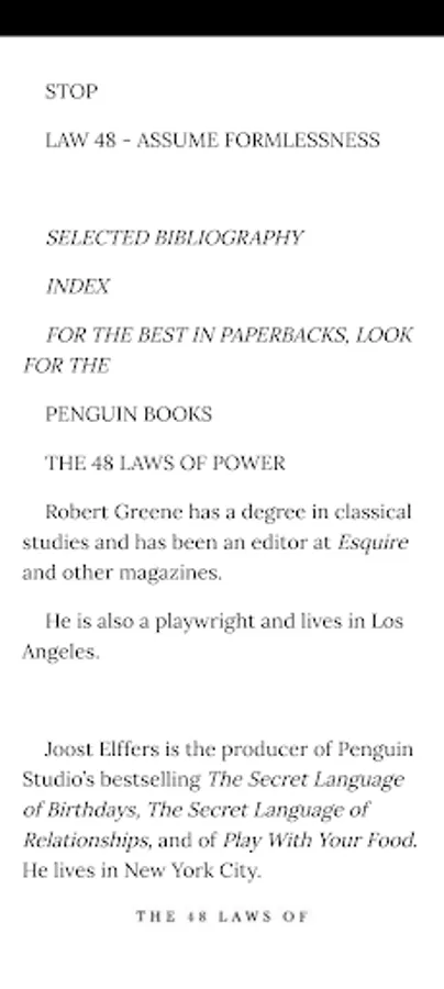 In the book that People magazine proclaimed “ beguiling” and “fascinating,” Robert Greene and Joost Elffers have distilled three thousand years of the history of power into 48 essential laws by drawing from the philosophies of Machiavelli, Sun Tzu, and Carl Von Clausewitz and also from the lives of figures ranging from Henry Kissinger to P.T. Barnum.