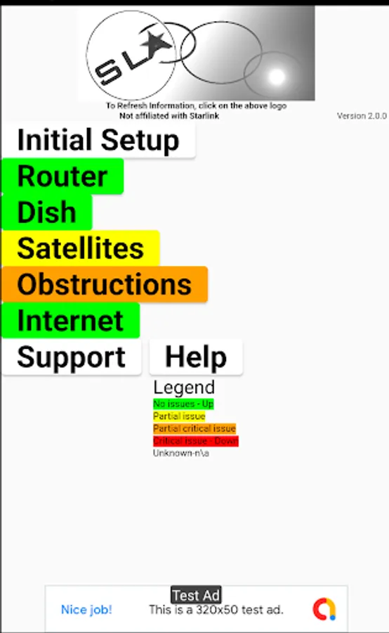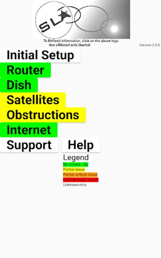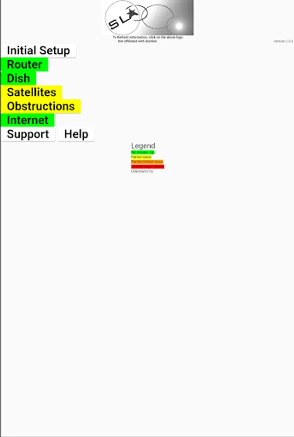 I wrote the Starlink Assistant App(SLA) because integrating the Starlink System into my home Internet system was a bit difficult. Another reason is that seeing how the Starlink system works is great fun. I want this app to help everyone identify and fix issues, use, and enjoy Starlink. The app uses color images and help pages to assist you navigate through most issues. The main page displays general information about how it is performing.