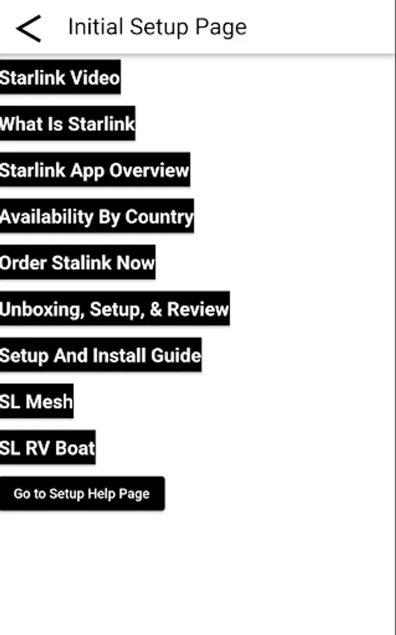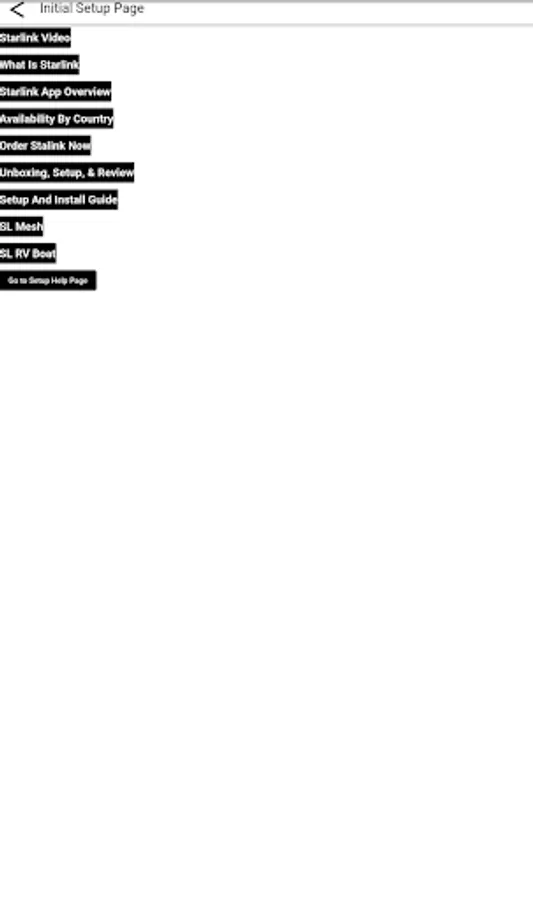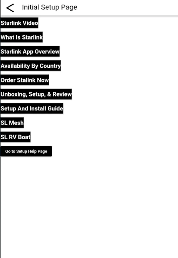 The Initial Setup page describes how to unbox & connect all equipment and wiring, install dishy (the Starlink Antenna), and configure the WiFi router. It also has YouTube links to explain how to unbox, install Dishy, configure your wifi router, and how to run a network cable.