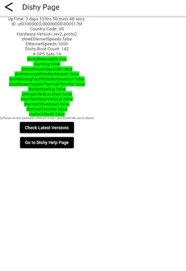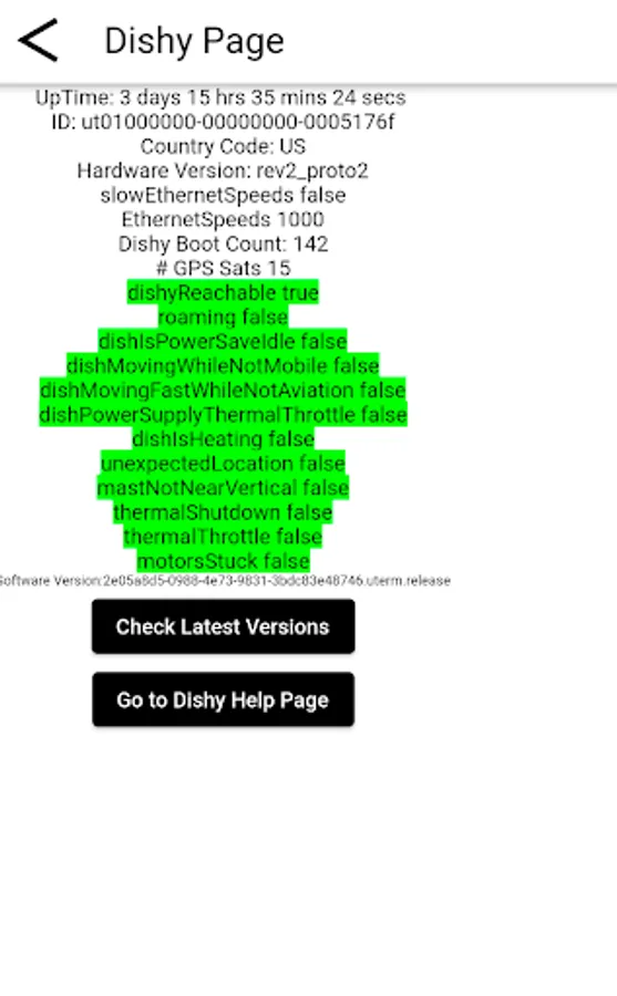 The Dishy page displays your antenna/Dishy uptime, physical issues (if the motors are stuck, an issue with temperature, mast not level, or unexpected location), and hardware & software versions.