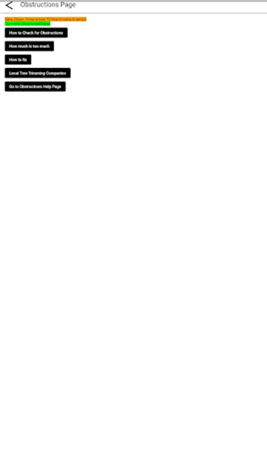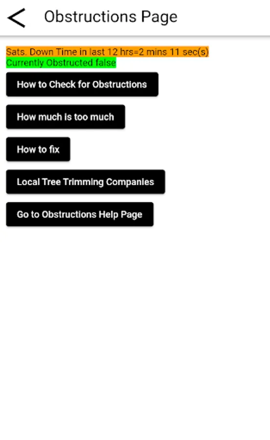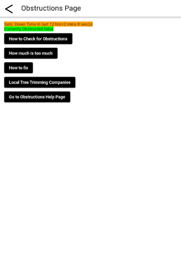 The Obstructions page will display if there is a current Obstruction between Dishy and a satellite, Uptime, Obstruction recommendations and status. In case the obstruction is a tree, the app has information on local tree trimming companies.
