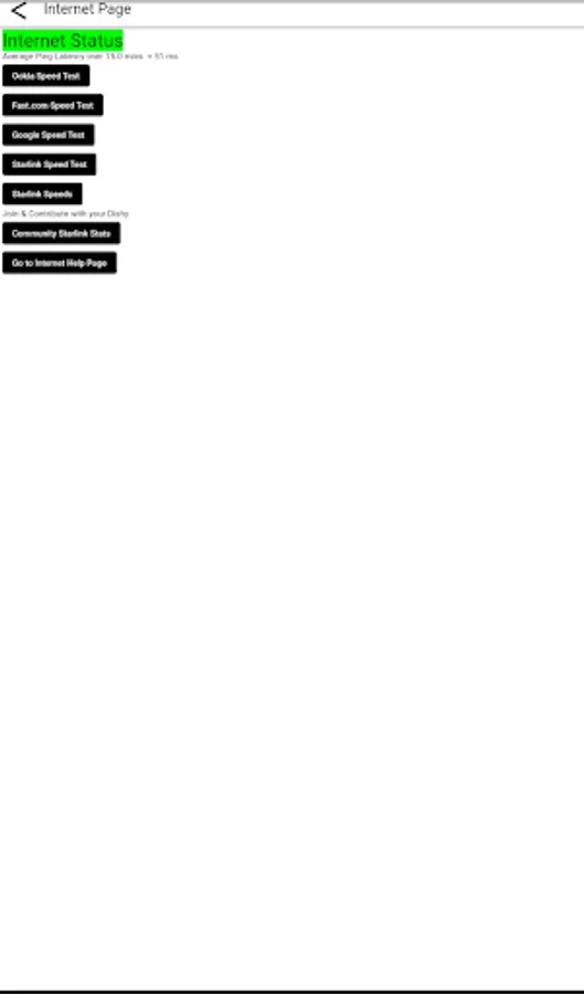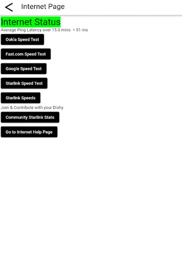 The Internet page will display whether the Internet is up or down, average latency times, Internet Speed time for Dishy(Direct Internet times), 4 different speed test checkers and Youtube links for instruction.