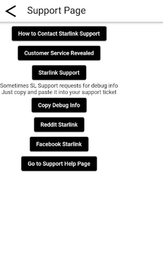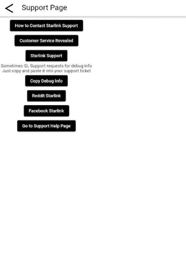 The Support page how to get Starlink Support, getting the debug information and links to popular Starlink support.