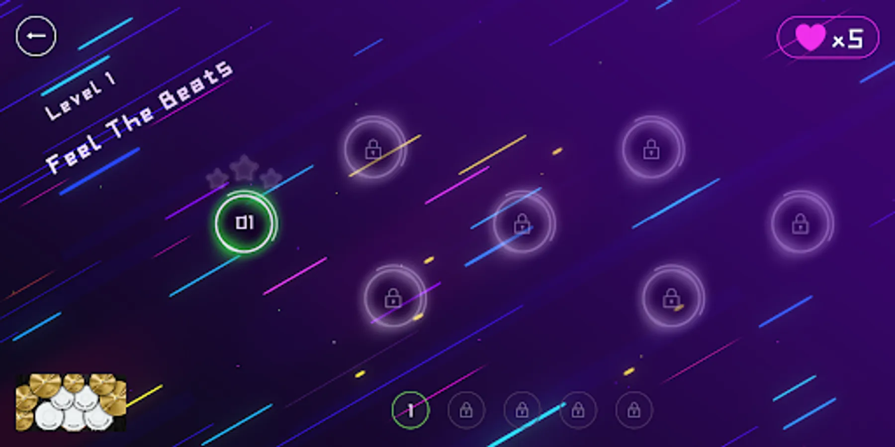 Complete levels to unlock new drum kits on the go. Ten various graphics stunning drum kits from different styles (acoustic, electronic, pad) and genres (pop, rock, etc.).