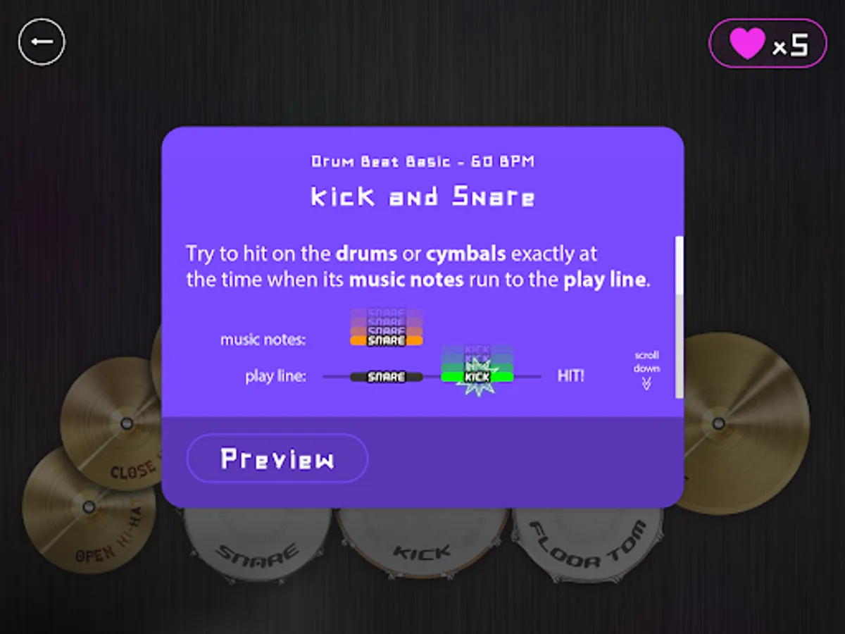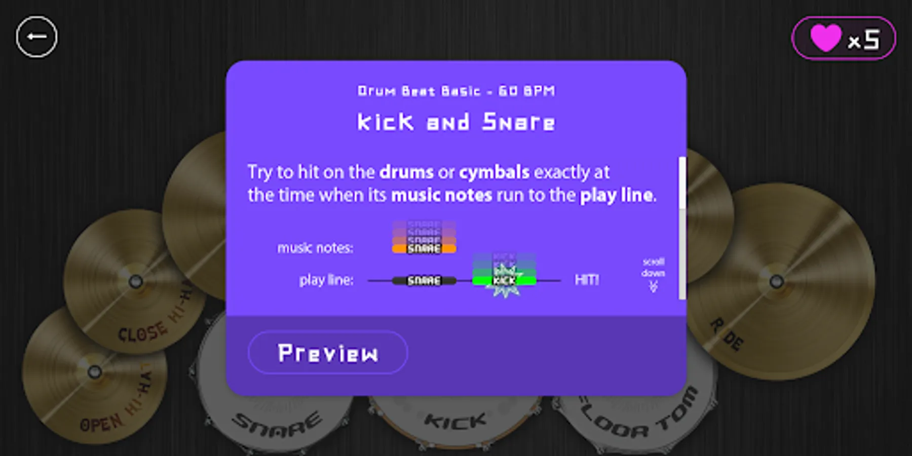 Step by step guide of how to play drums. This game leads you from drum beat basis, to drum grooves and drum fills of different music genres. In later levels, you will be challenged to play with real songs.