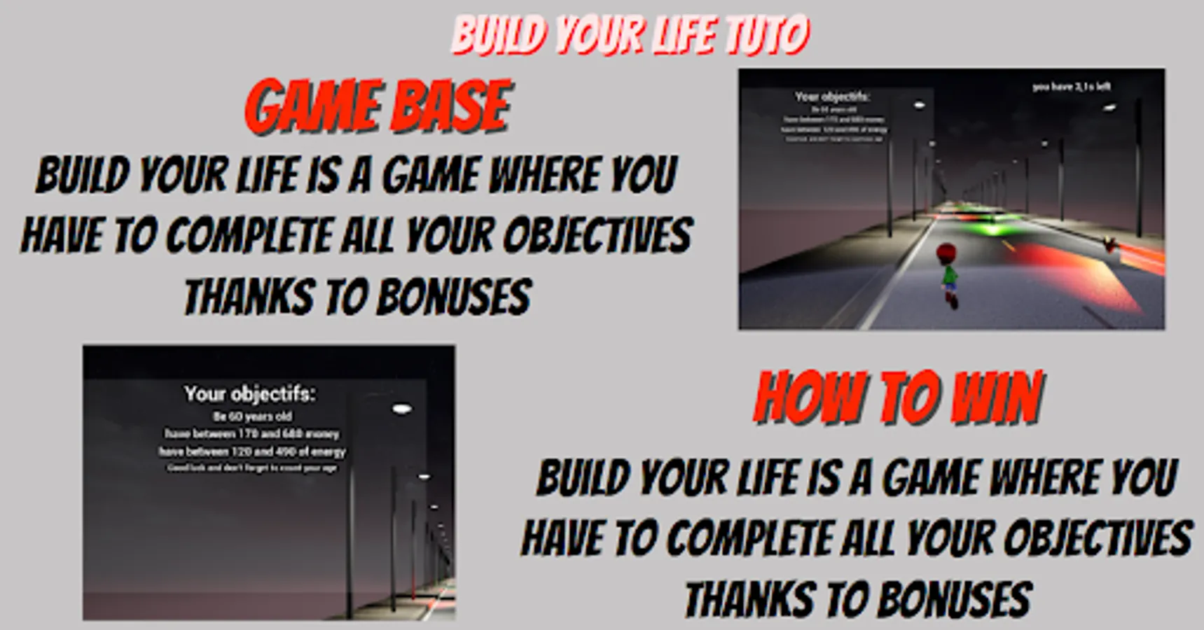 Build Your Life is a game where you play as a little boy your goal is to accomplish your goals according to your energy, money and agel "THIS GAME IS IN THE BETA STAGE"