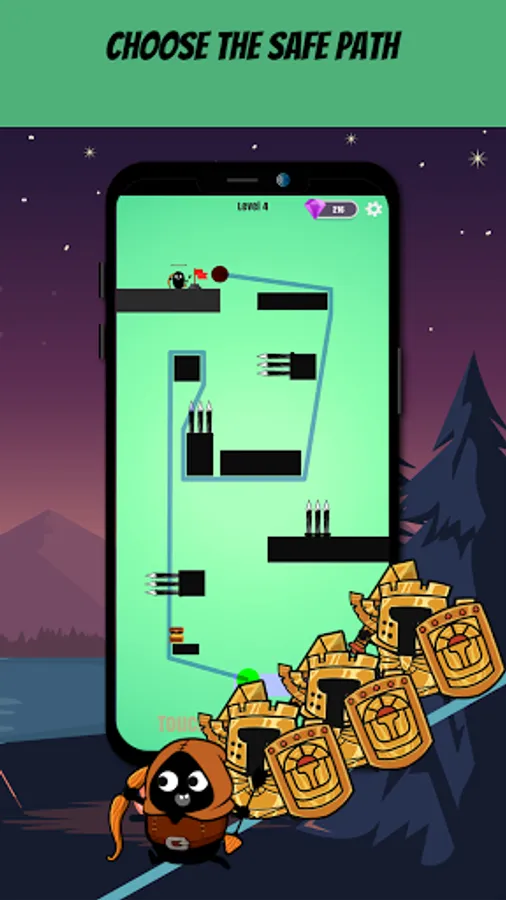 ♦️ On the way to the destination has some traps harm your soldiers, draw a line to avoid those traps, the line can be rolled into safe blocks. You can also collect the treasure by letting the soldier walk past the treasure chest.