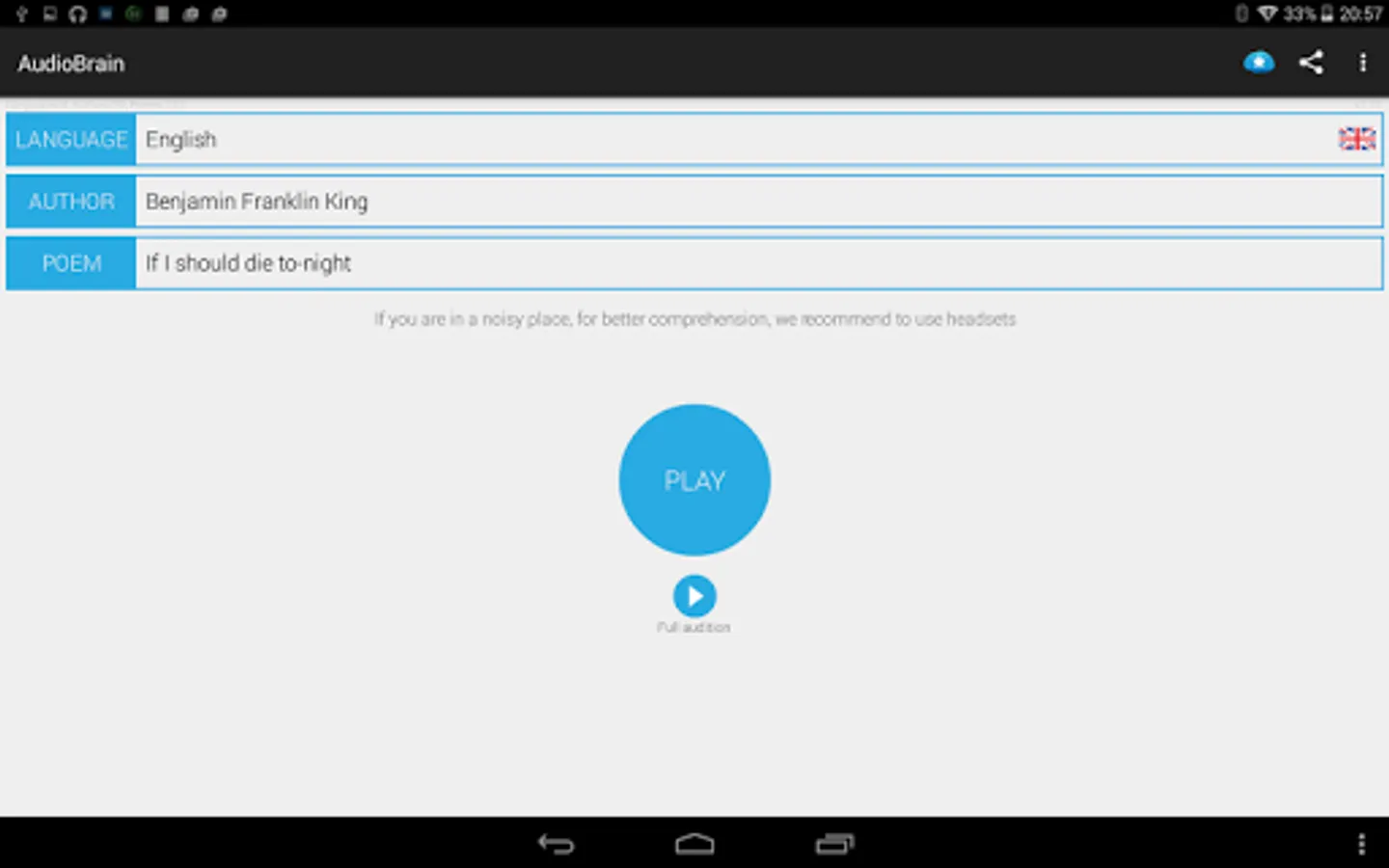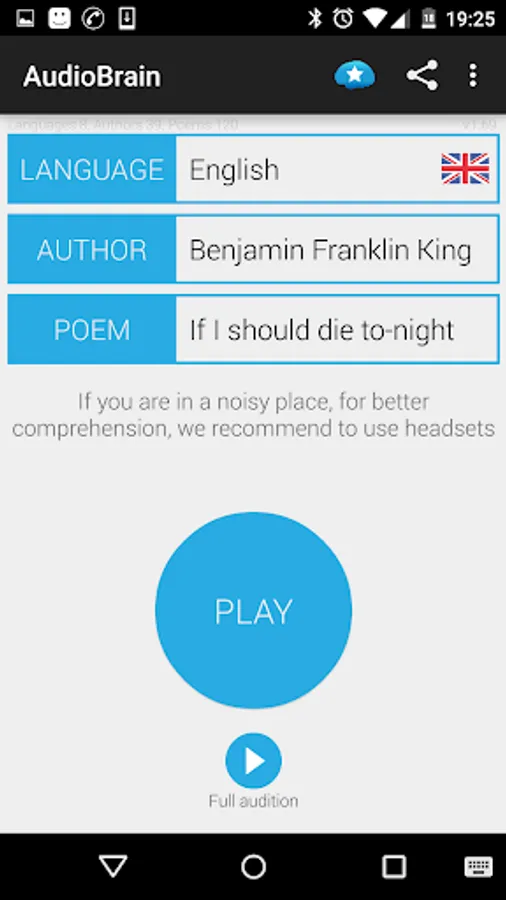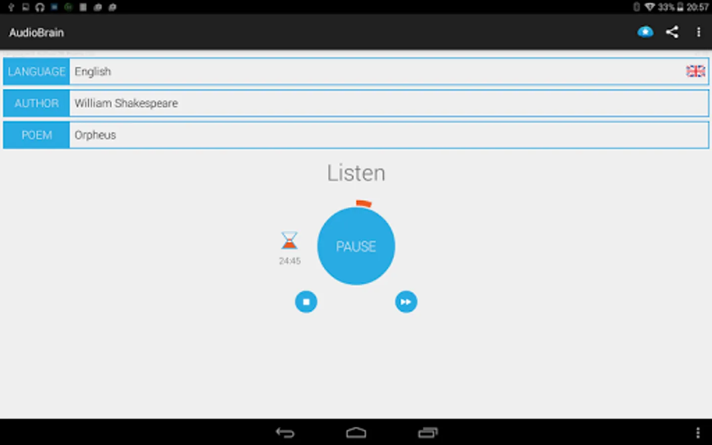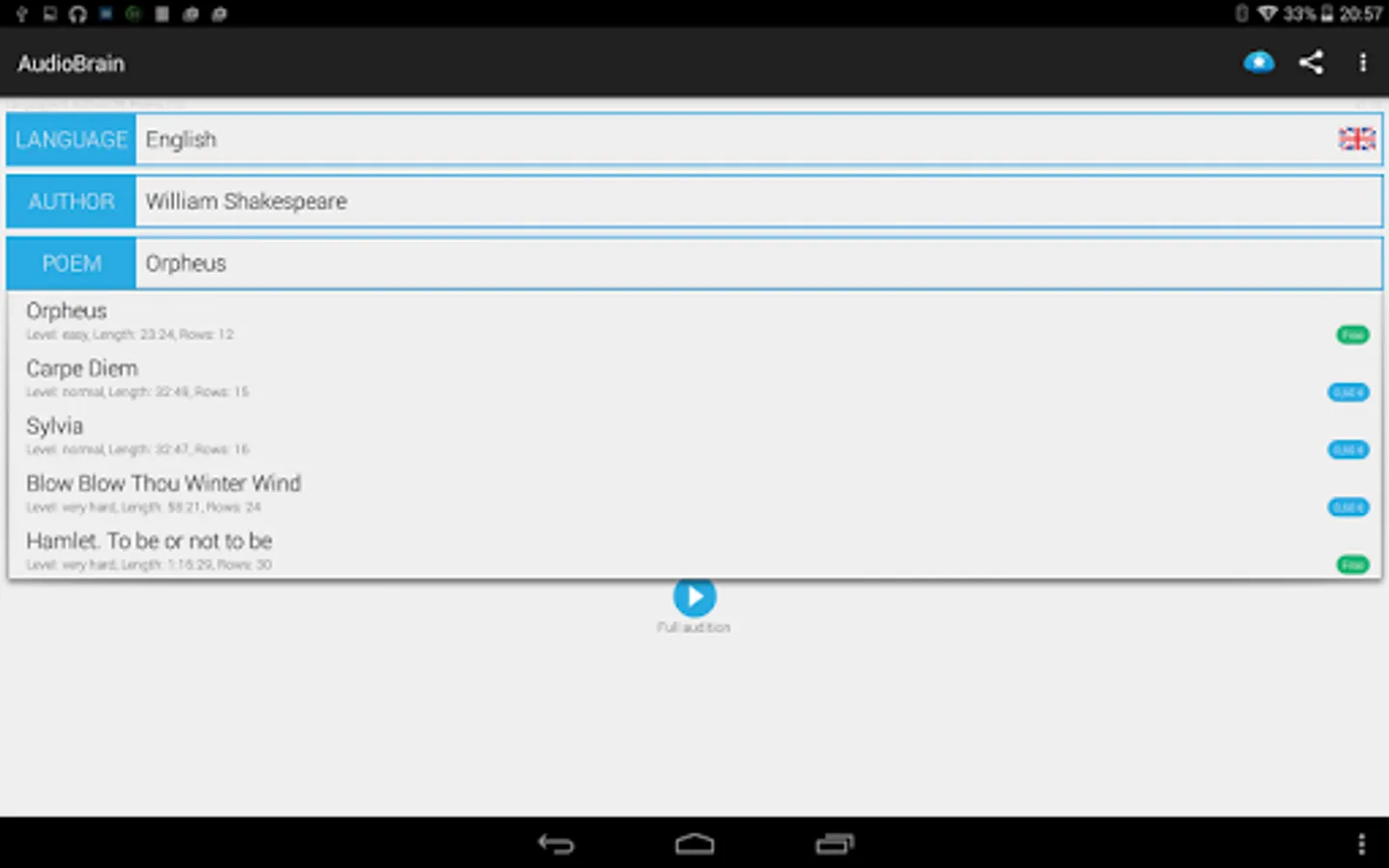 AudioBrain is a uniquely designed memory development technique based on listening to the world's classic poetry by Shakespeare, Pushkin and Cervantes, professionally read by native speakers. Stimulating the underactive brain regions responsible for processing audio data the application takes your perception of any information to a new level.