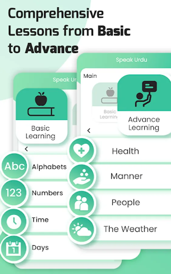 Start speaking Urdu from the very basics. Learn Urdu with Urdu alphabets, speak it with Urdu numbers, learn Urdu masculine and feminine, Urdu days, how to ask, and tell the time in the Urdu language? And learn Urdu food names, body parts in Urdu, Urdu color names, how to name Urdu animals, and learn how to write different languages in Urdu, and last but not least is full sentences of Urdu and Urdu phrases and clauses that will enable you to speak Urdu fluently without putting too much effort. So here is what you will find in the basic level learning area of the speak Urdu application.