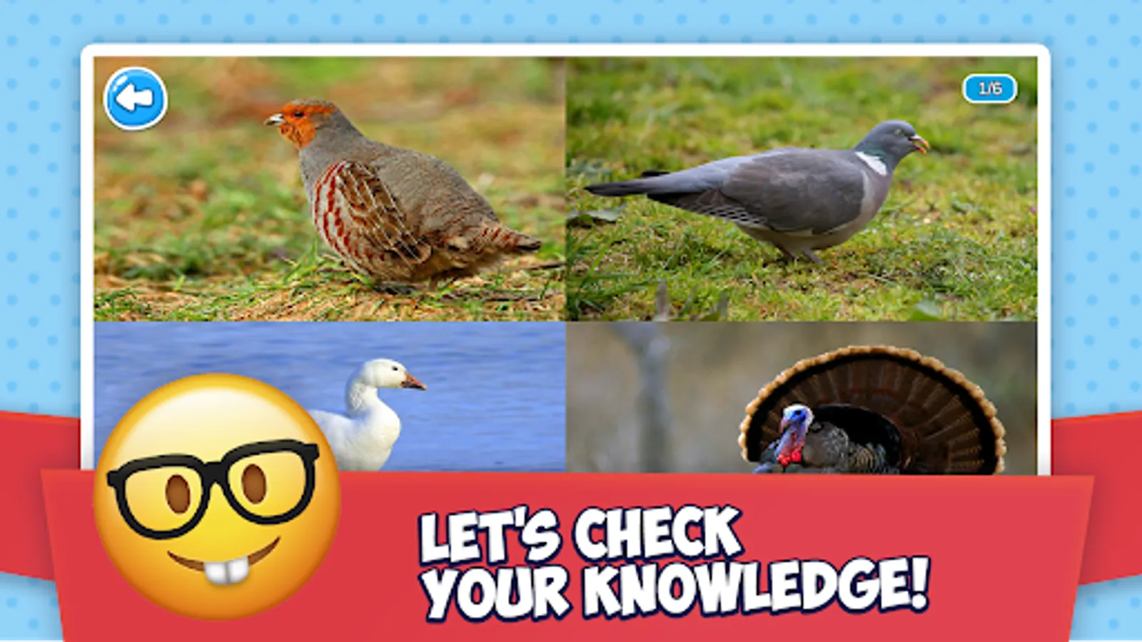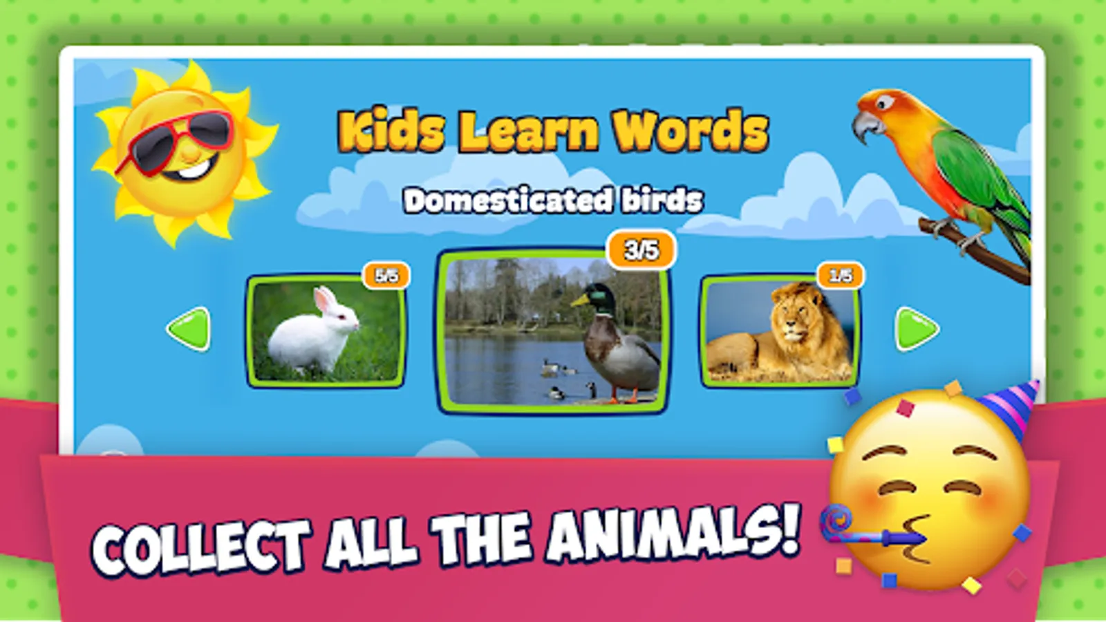 In this kids learning game you play and memorize new words from many categories, such as “wild animals”, “domestic animals”, “domestic birds”, “wild birds”, “amphibia”, “reptiles”, “insects” etc.