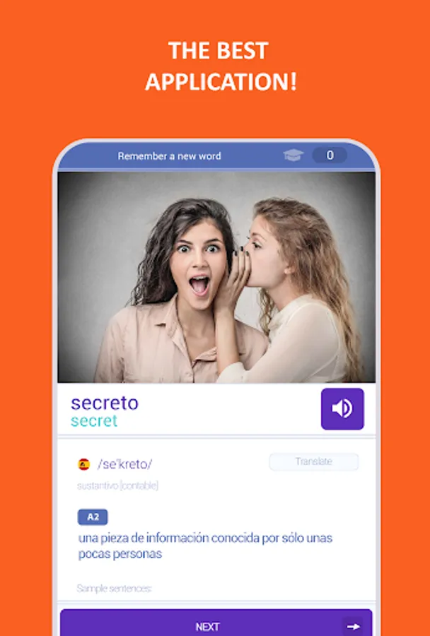 • Spanish app with flashcards and sentences with examples of using these words. More than 10,000 thousand words.
