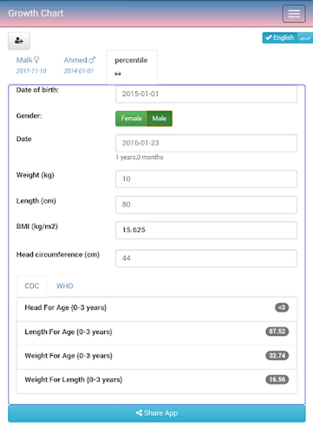 4- Percentile/Z-Score, By entering Date-of-Birth, Date ,Gender, Weight, Length/Height, Head-Circumference, you can view the percentiles.