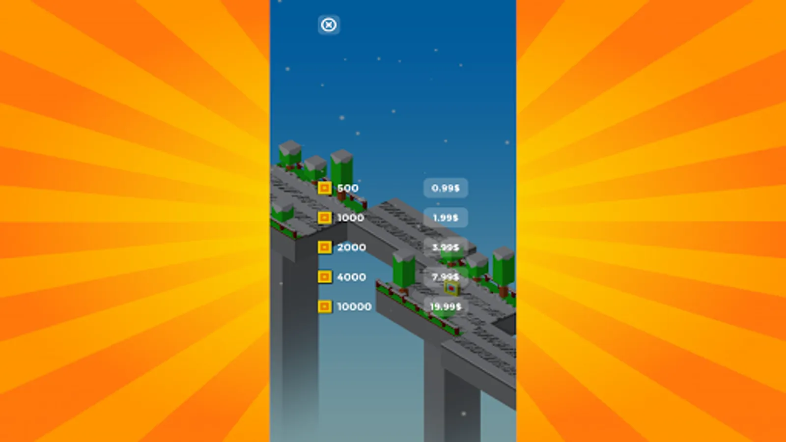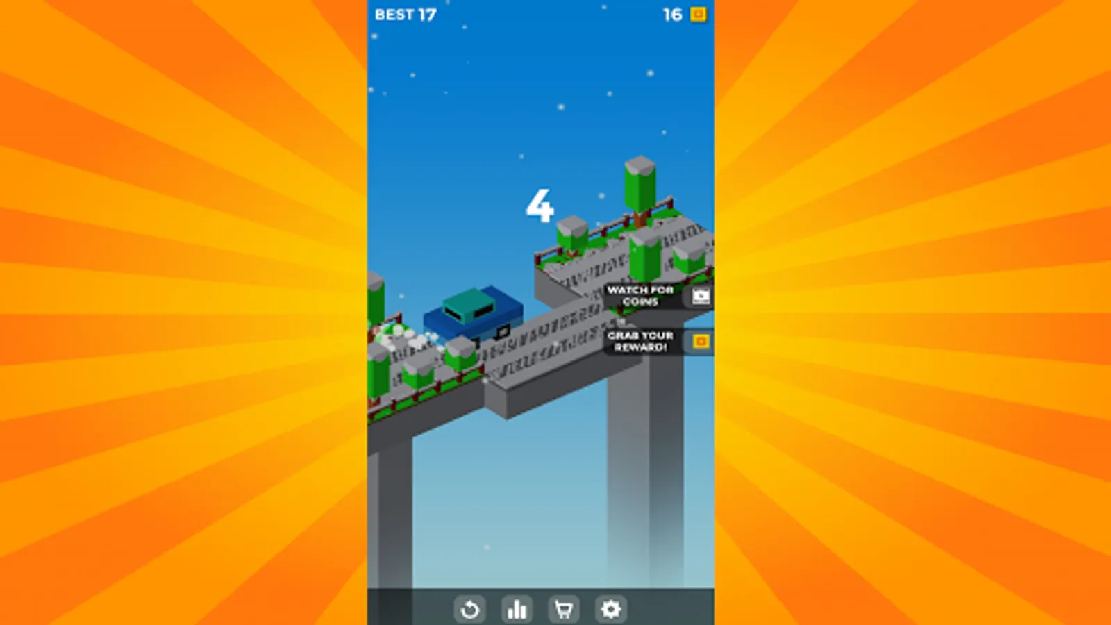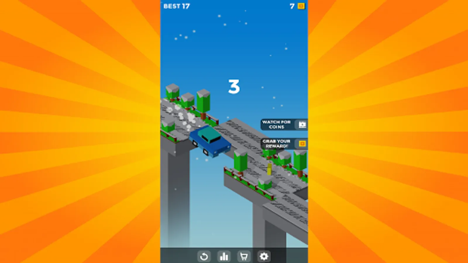 Play Crossy Car here, stop platforms to create a road for the car to pass. Tap on the screen to start and stop the vehicle driving platform on the road. Drive your car as far as possible without falling into a cliff.