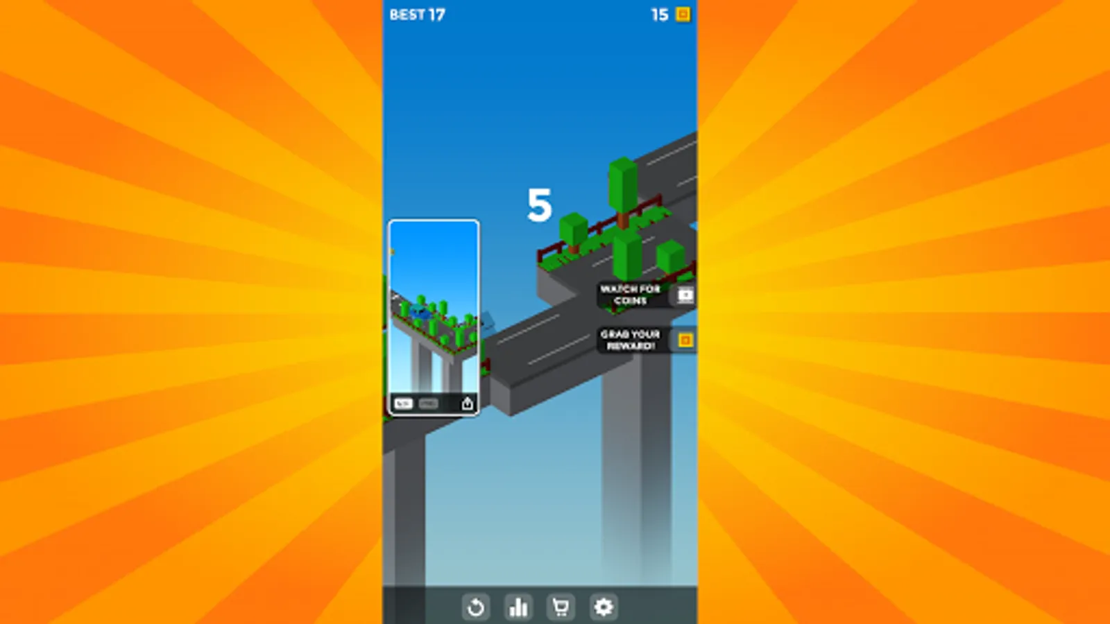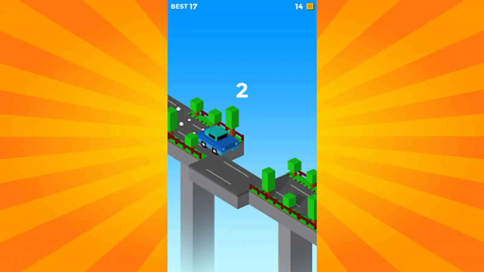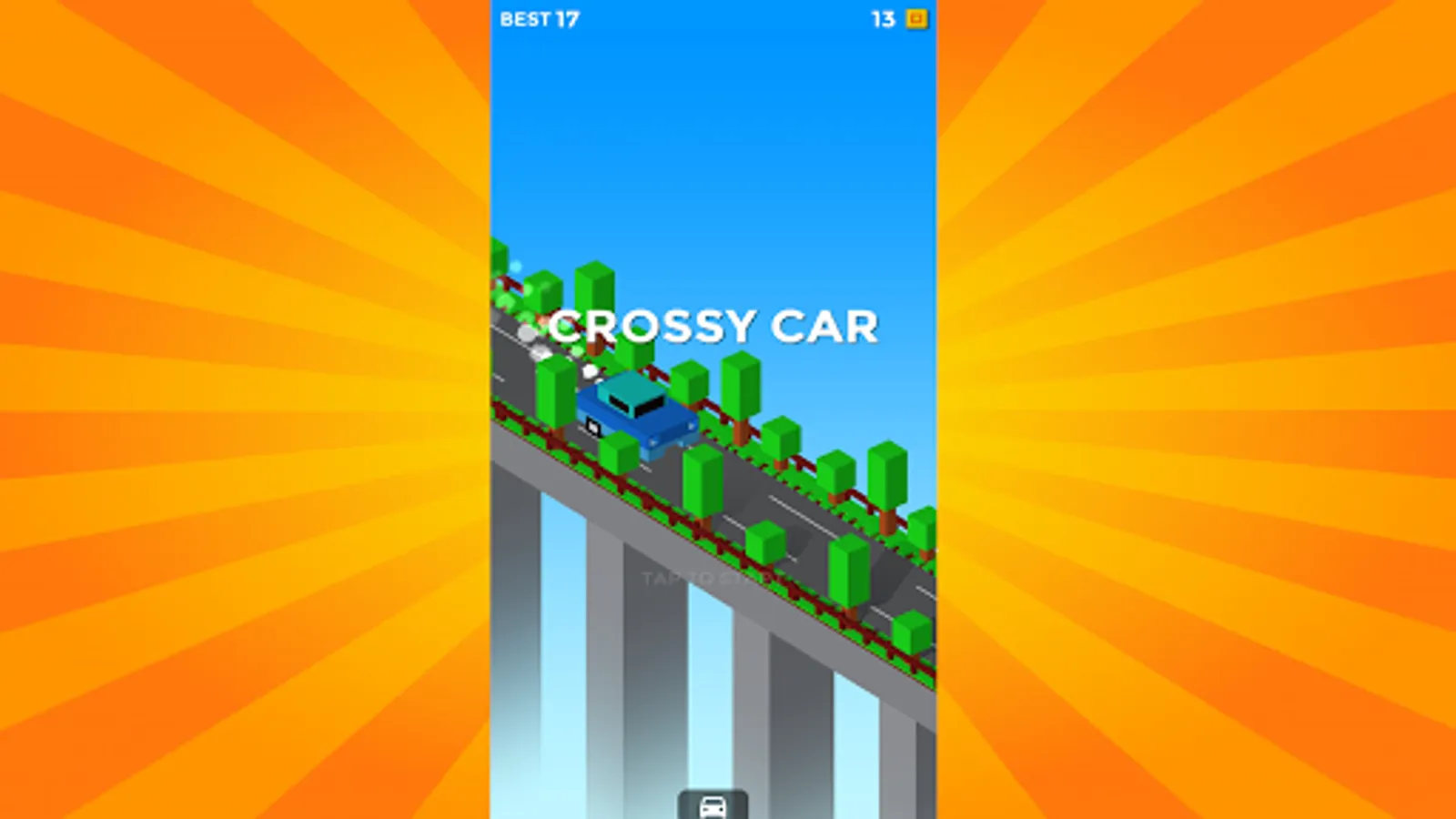 Crossy Car has gameplay involving 3D graphics. The object of the game is to manage the bridges of the road, which continuously move between the sides at times connecting the road. If the bridge is not stopped correctly, the car falls and the game ends. Control is performed by touching the screen, at which the platform stops for the car to pass. If the platform does not stop correctly, there is no road for the car, and the game also ends. Points are earned each time the vehicle successfully passes the platform. The gameplay does not change throughout the entire game.