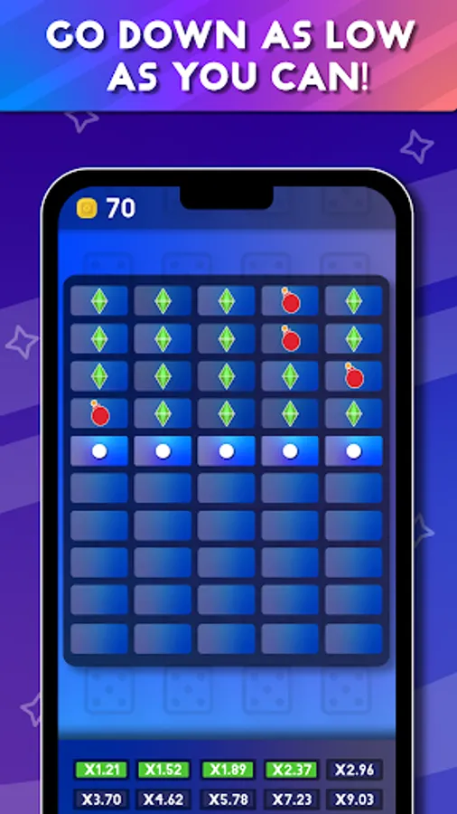 Go down the stairs as low as you can, guess where the crystal is, and don't hit the mine. The lower you go down the ladder, the bigger the win! You can set how many min.