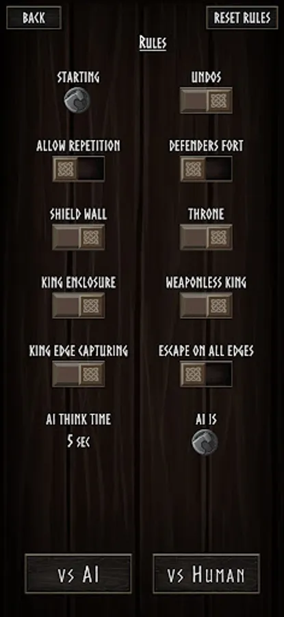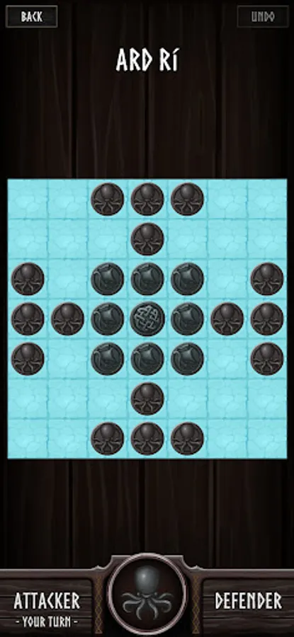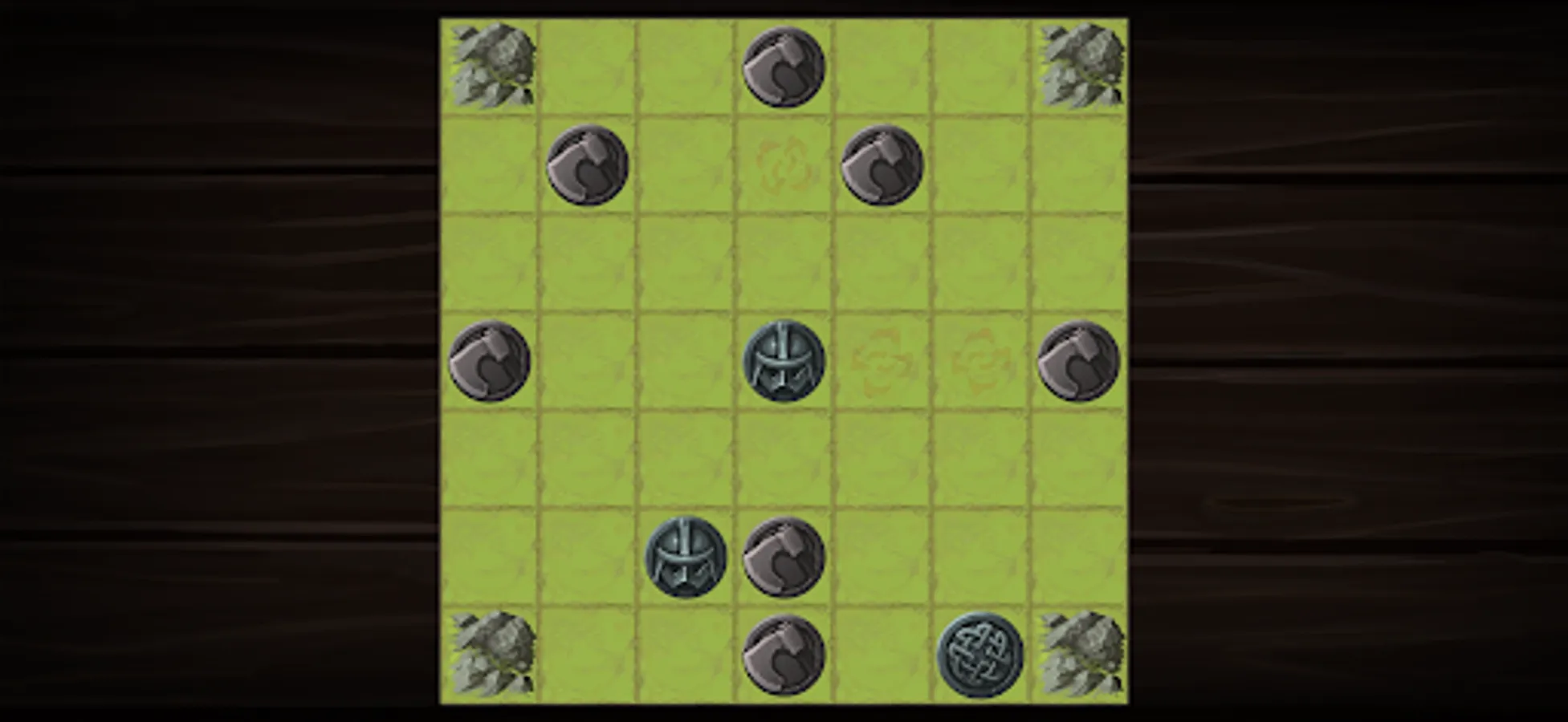 Various versions of the game have been found, often with parts of the ruleset missing, which has led to many different rules and setups. This game contains some of the most popular versions like ArdRi, Brandubh, Hnefatafl, Tablut, Tawlbwrdd. There is also support for custom rules like Shield Wall, King Enclosure, Defender Fort, Weaponless King, etc