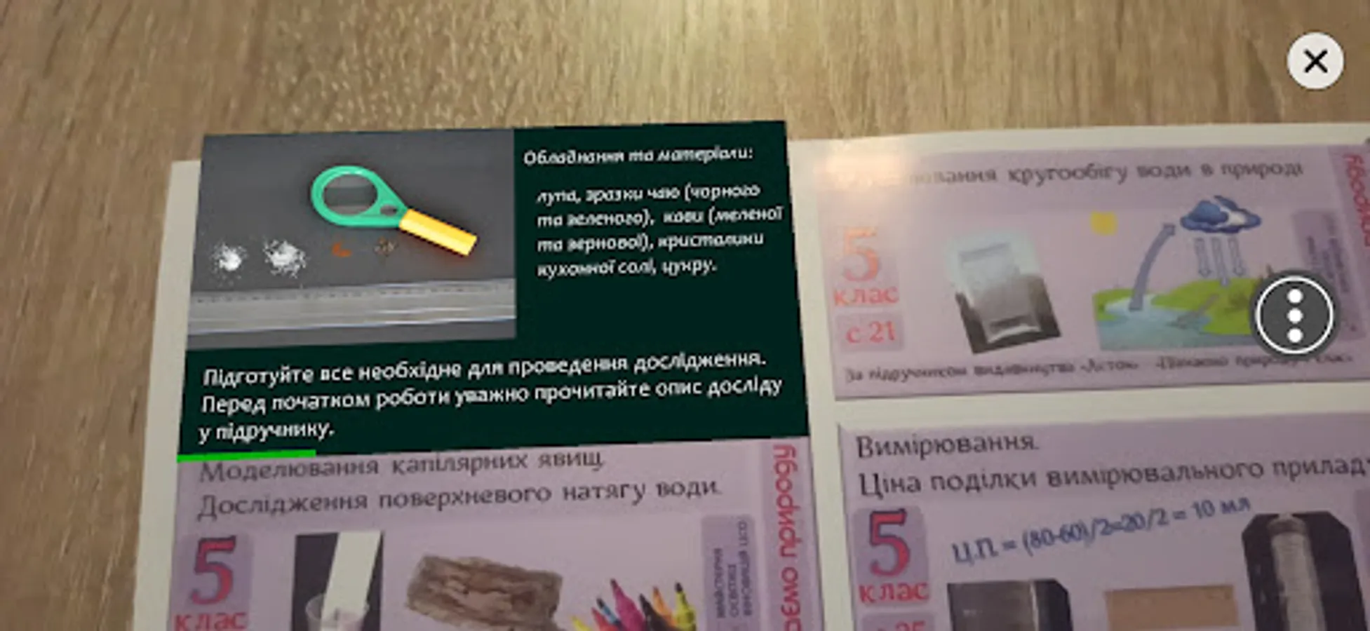 By pointing a mobile device with the installed program at the "marker" picture, you can play a video of practical work or a home experiment, the name of which is indicated on the marker. Videos are created with a clear explanation of all actions, which makes it easier to repeat the experiment in real life.